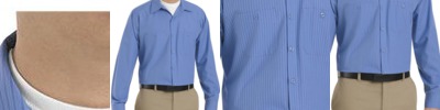 3.4 oz., 100% cotton yard dyed poplin; semi-fitted styling; gingham microcheck pattern; soft-collar styling; curved hemline; long-sleeve with two-button cuff; sleeve guard; Oeko-Tex® Standard 100 certified; WRAP certified;